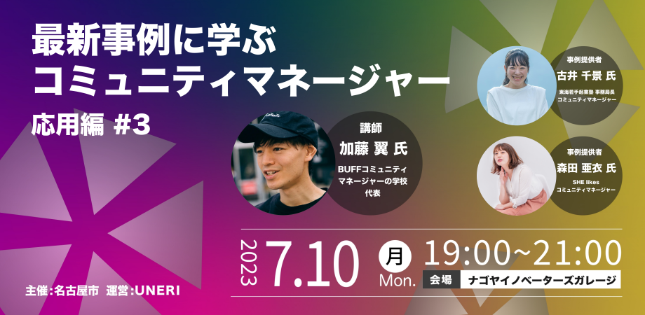 また、名古屋地域で実際にコミュニティ運営に取り組んでいるゲストの2名をお招きして、実例の共有を行なっていただき、当地域におけるコミュニティマネージャーとしての具体的な取り組み内容からノウハウを学びます。