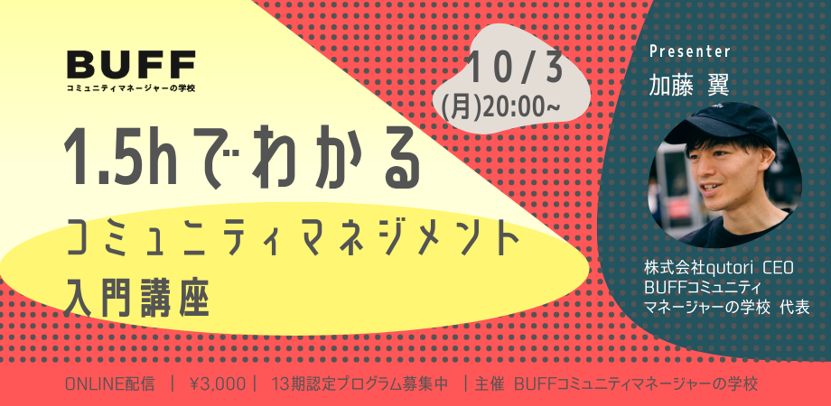 BUFF コミュニティマネージャー の学校( https://buff-community.jp/ )を運営する株式会社qutori(本社:東京都渋谷区 代表取締役:加藤翼)は、 プロフェッショナルなコミュニティマネージャーを育成する、 第14期の認定プログラムの募集を開始しました。募集に際し、第13期生が3ヶ月間の受講成果をプレゼンする最終審査会や、応募前にプログラムの雰囲気を味わえる体験オンライン講座も合わせて実施します。