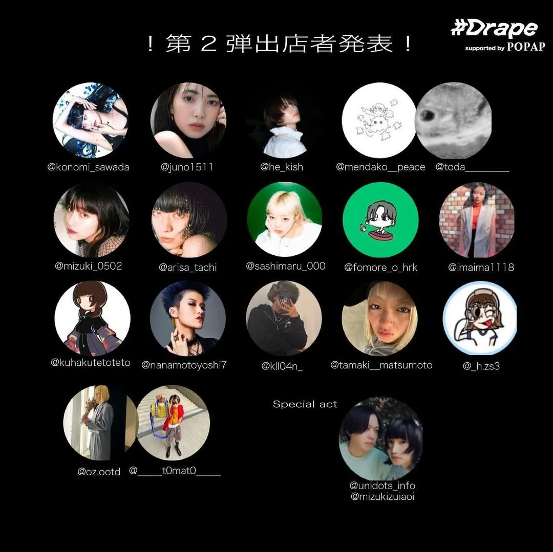 #Drapeは「等身大のスタイリングで憧れのインフルエンサーやモデルと一緒にモードを楽しむマーケットイベント」です。ファッションメディアDrape.tokyoの主催で、ポップアップ特化メディアPOPAPとのコラボレーションで企画が実現しました。