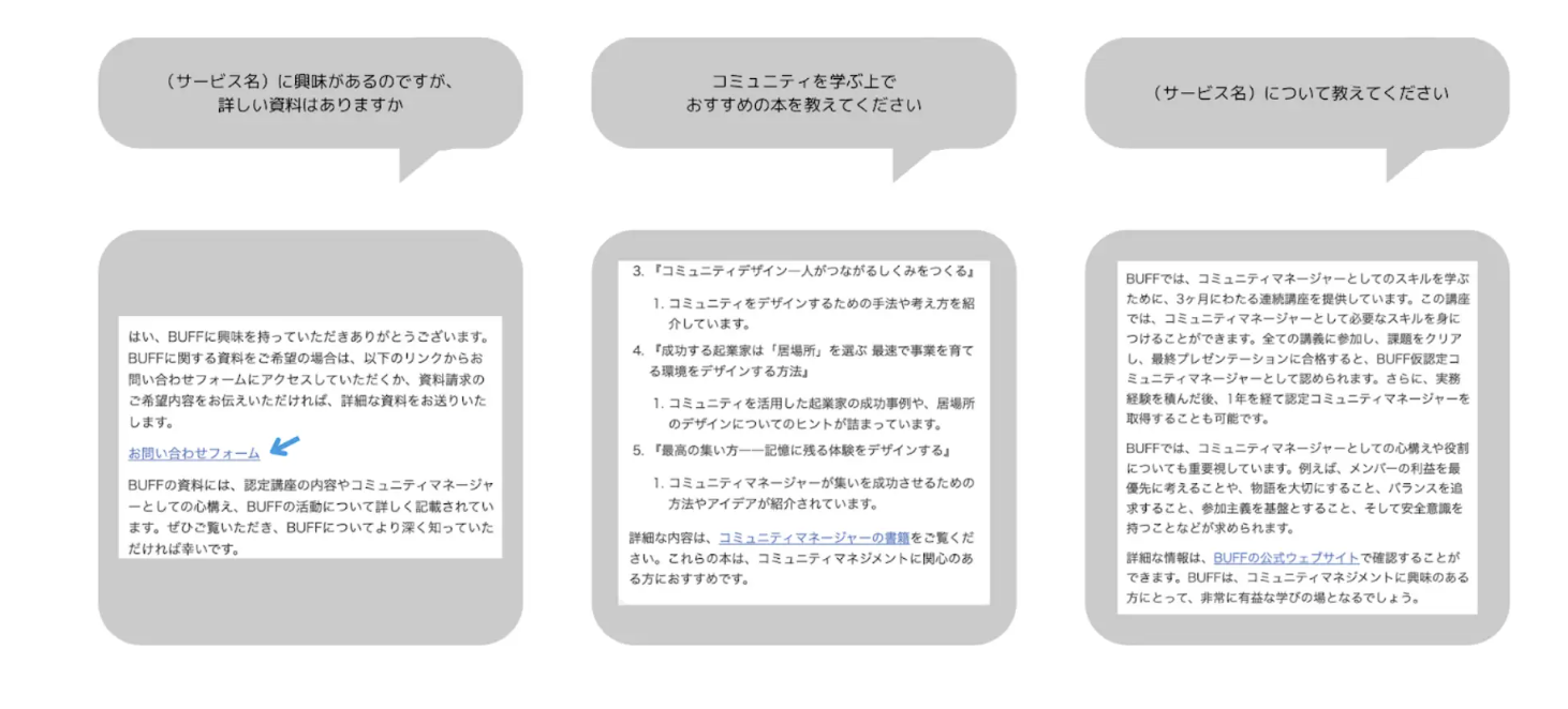 チャットボットには、株式会社qutoriが運営する「BUFF コミュニティマネージャーの学校」で使用するテキストをインプット。コミュニティへの理解を深める補助ツールとして、よりスムーズなコミュニティ運営をサポートします。