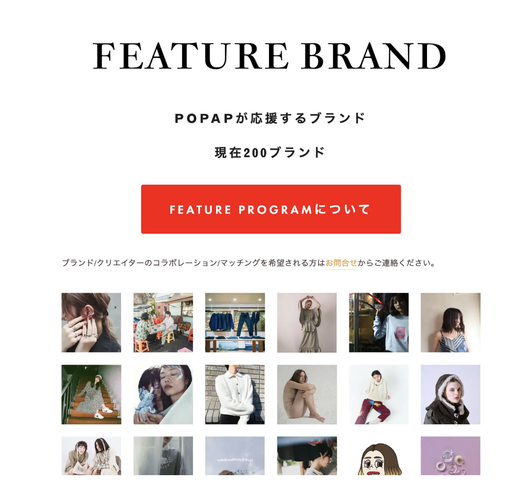 POPAPは「今、ここにしかない物語」を掲げ、ファンとブランドがリアルで対話するポップアップの可能性を広げるメディア&コミュニティです。2019年12月以降、主に個人で活動する若手クリエイター・ブランドの支援を開始しました。クリエイションの未来を共に切り開いていくブランド(個人のクリエイター、アーティスト、モデル、スタイリスト、シェフなどを含む)を、ポップアップイベントを起点にした「FEATURE BRAND」を通して支援しています。 FEATURE BRANDでは、POPAPのメディアやSNSによるPR支援のほか、ポップアップイベントへの出店機会の創出や通期でのブランディングなど、ブランドの運営に関わる多面的なサポートを実施。2023年に登録ブランド数が200を達成しました。